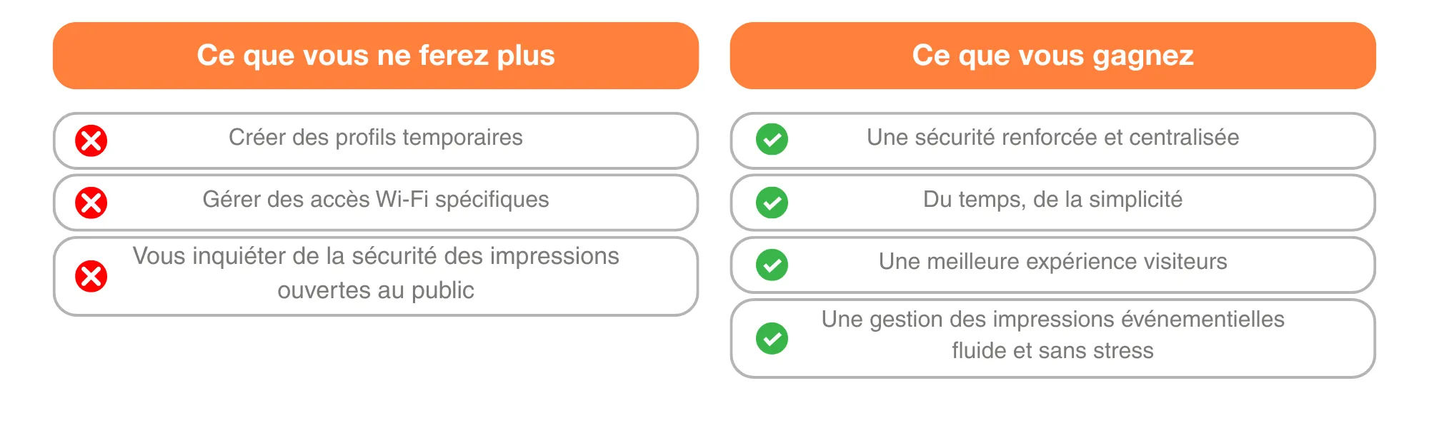 Skyprint permet à tous vos visiteurs (externes, partenaires, prestataires, collaborateurs nomades…) d’imprimer en toute autonomie, sans être connectés à votre réseau, et sans avoir besoin de droits ou de création de compte.